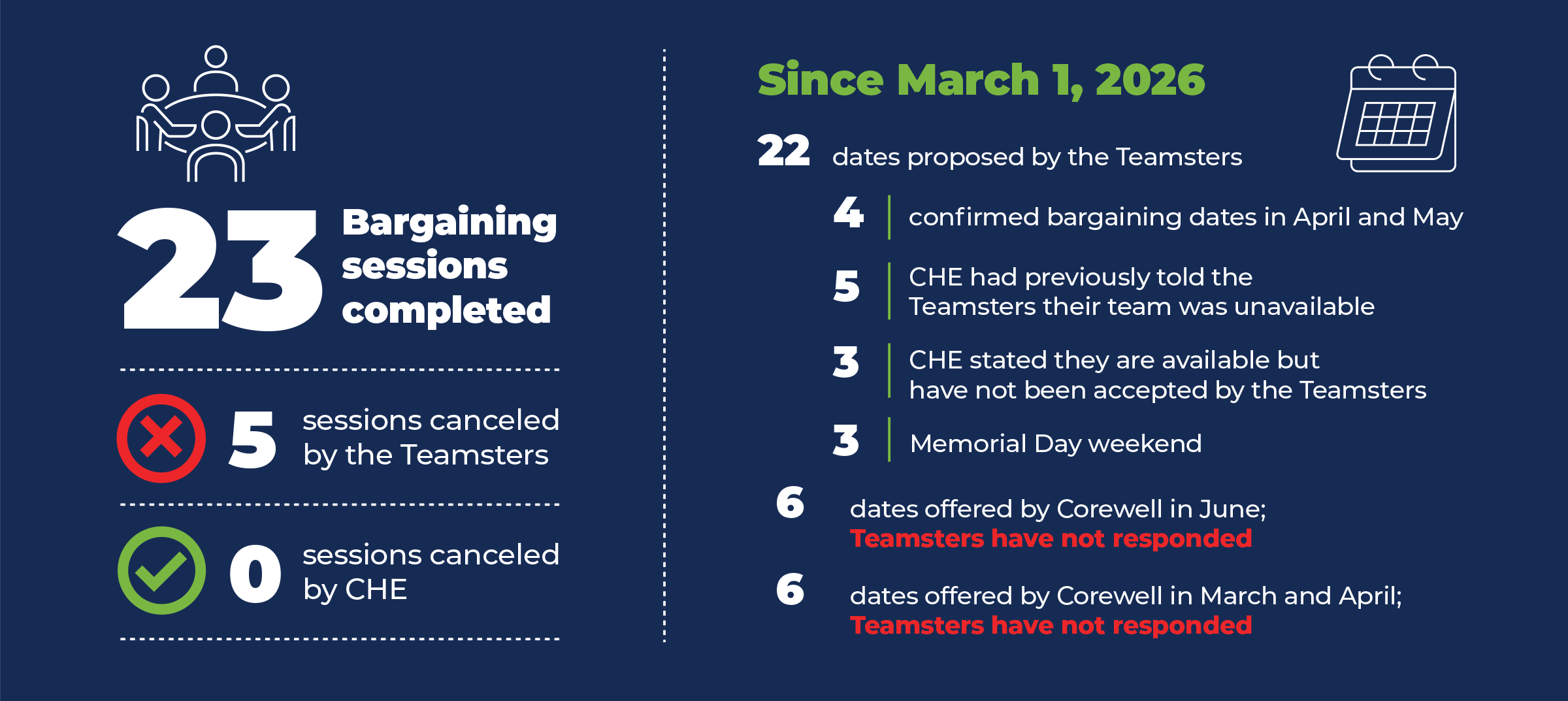 The Teamsters’ claim that Corewell Health has delayed negotiations or not accepted 22 dates proposed by their bargaining team is misleading. Some of the dates they “offered” were already agreed upon and scheduled, and others Corewell Health had previously told the Teamsters our team were unavailable. We have continued to offer other bargaining dates, but the Teamsters have not responded. Our focus remains on negotiating in good faith and reaching an agreement.